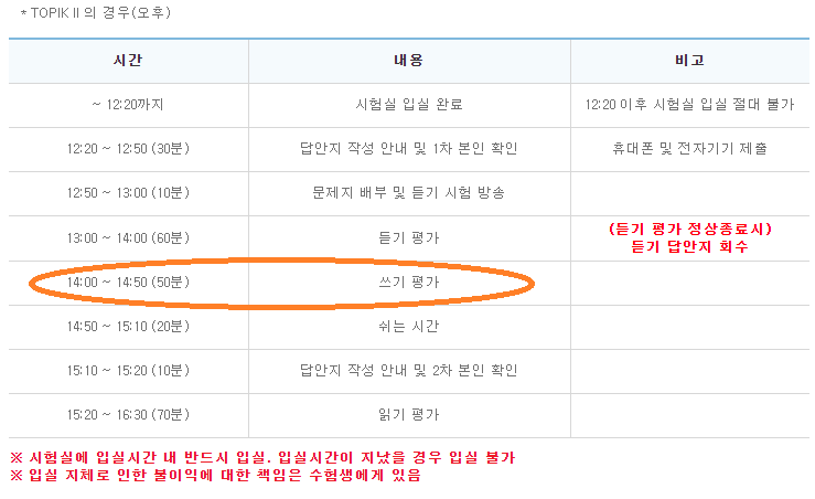 시험은 시간과의 싸움입니다. 각 문제마다 시간을 잘 나누어서 풀어야 합니다. 아래 사진은 토픽 시험 시간 규정입니다. 쓰기 평가는 50분입니다. 이 50분 안에 54번까지 다 써야 합니다. 3급이나 4급을 목표로 하는 학생들에게는 조금 부족한 시간입니다.